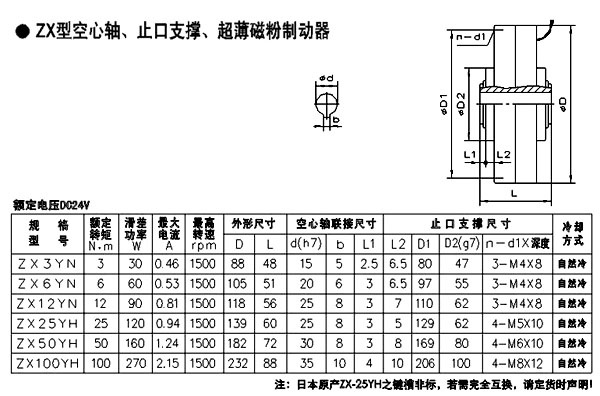 ZX型空心軸止口支撐超薄磁粉制動器型號標(biāo)準(zhǔn)參照日本三菱電機ZX-YN型產(chǎn)品、ZX-YH型產(chǎn)品。