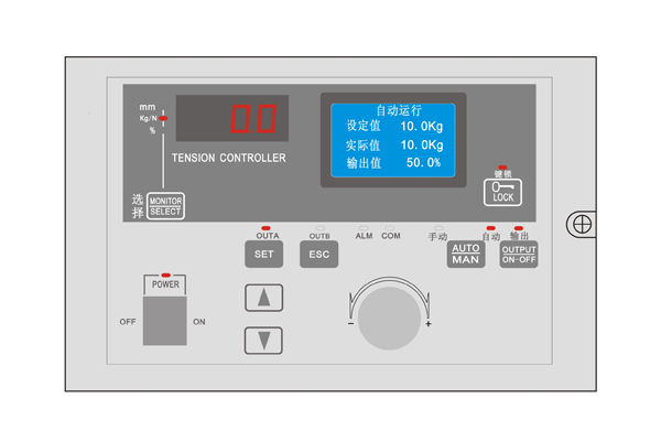 KTC838全自動(dòng)與卷徑張力控制器采用圖形液晶顯示器,可選擇中、英文顯示,界面友好易用,可輔出CH24V/4A直接驅(qū)動(dòng)磁粉離合器,磁粉制動(dòng)器,也可以輸出0~5V,0~10V信號(hào),控制變頻器,伺服電機(jī)或其它執(zhí)行機(jī)構(gòu),對(duì)卷料系統(tǒng)進(jìn)行高精度的張力控制。KTC838全自動(dòng)與卷徑張力控制器廣泛應(yīng)用于造紙、印刷、包裝、紡織印染等行業(yè)。